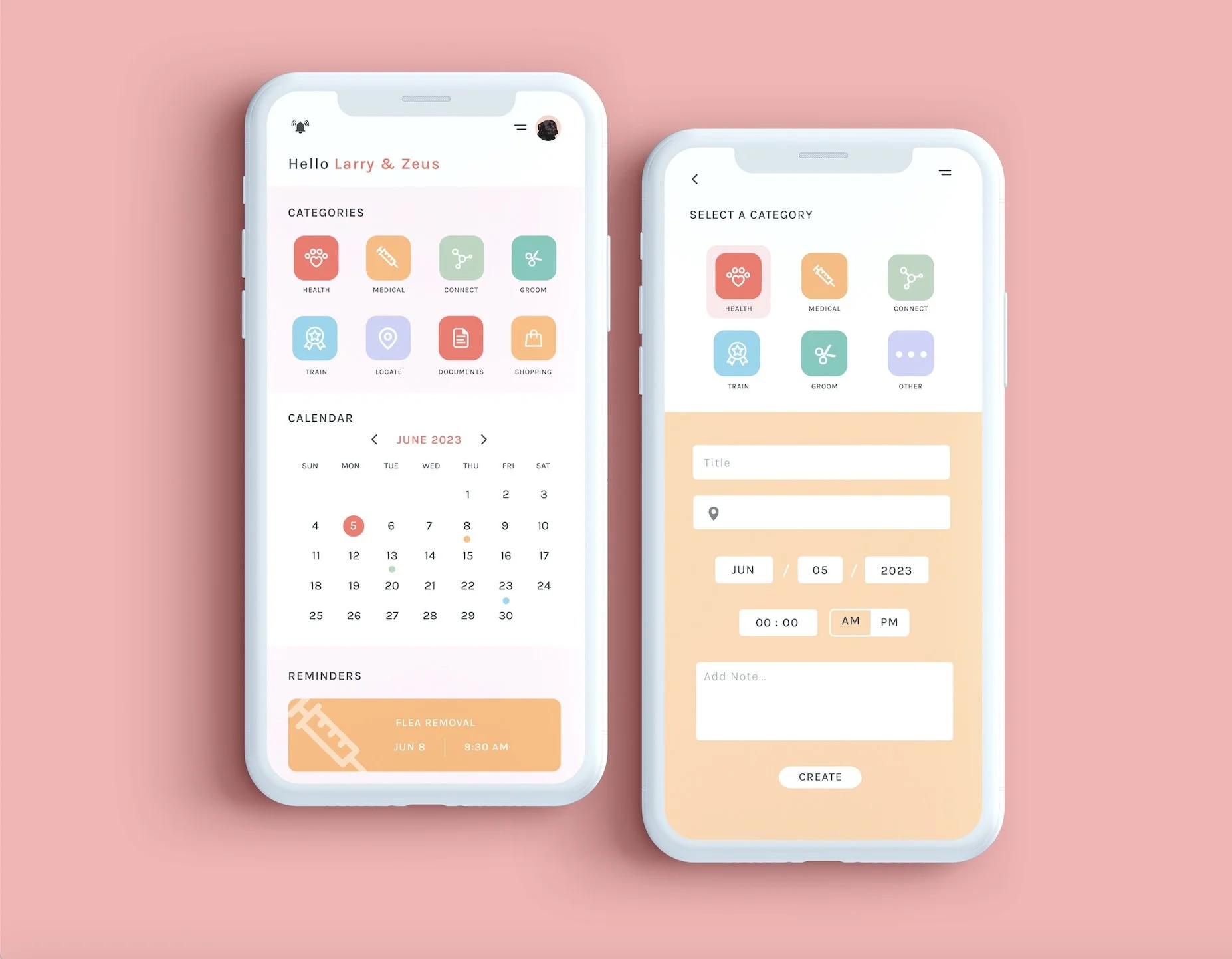 The dashboard is where all the magic happens. The app has 8 main features for users to access information and files related to health, grooming, medical, shopping, training, locating, connecting, and documents. Users can also access a monthly calendar on the app’s dashboard that tracks any previous or upcoming tasks from medical appointments to events! Each feature is color-coded to help the user navigate the app and calendar efficiently.