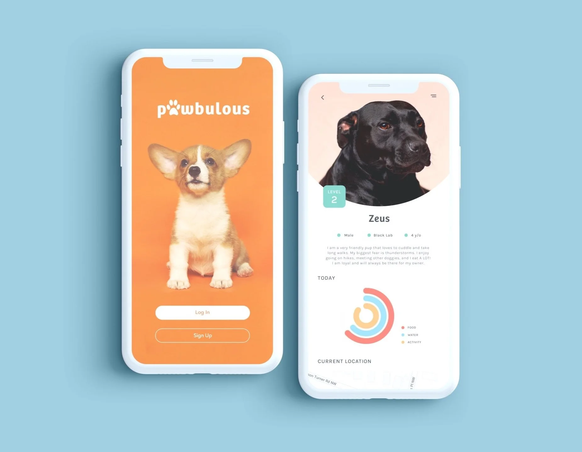 Upon downloading Pawbulous, the user is asked to create an account for their pet! They can add a short biography and basic information that friends can see when they view the profile. Pet owners can keep track of their pet’s feeding and activity on their profile to make sure their furry friend is getting everything they need throughout the day. If the owner purchases a tracking collar through Pawbulous, they can view the pet’s current location on this screen!