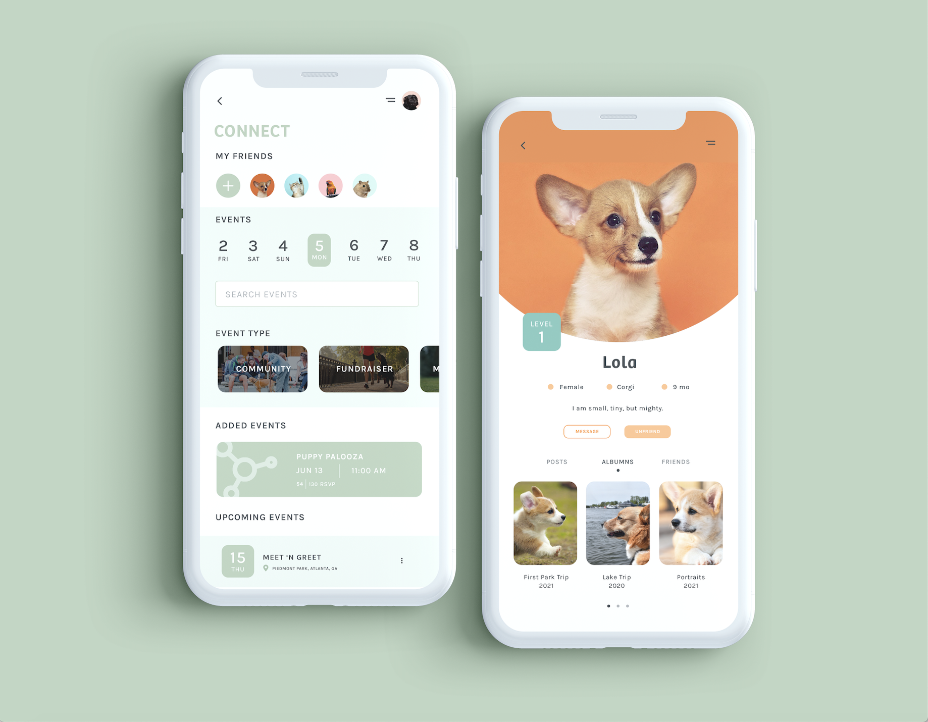 Through the “Connect” feature in the app, users can connect with other pet-owners! They can also discover upcoming events such as fundraisers and meet-and-greets. Events of interest can be saved and added to the user’s calendar on the app’s dashboard.